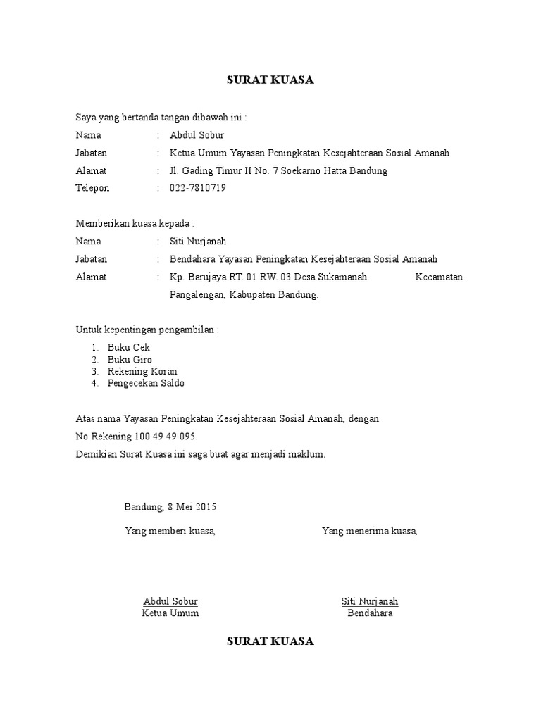 Surat Kuasa Pengambilan Cek Contoh Pdf